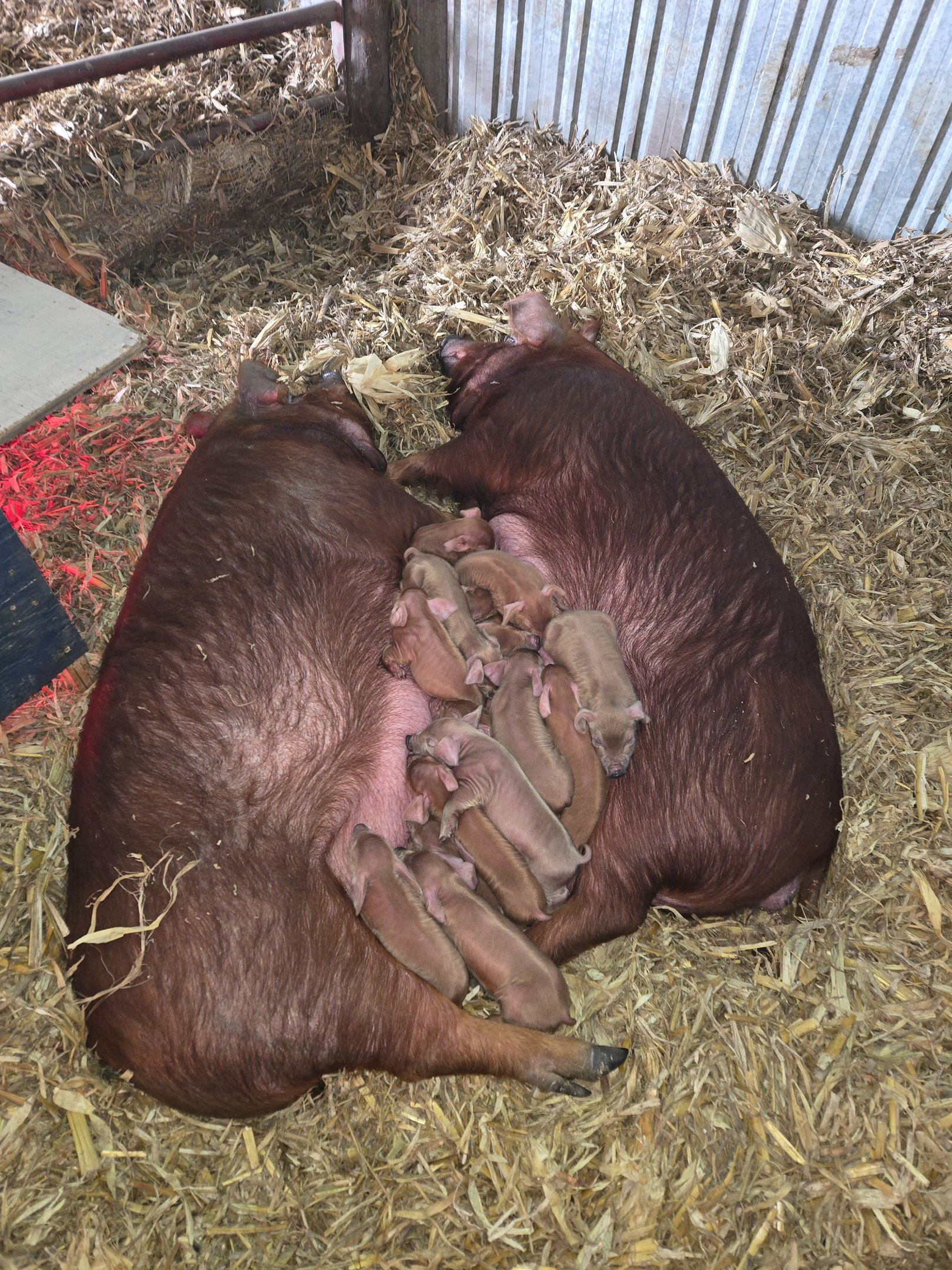 These two girls are sisters and this is their first time farrowing, but you wouldn’t know it. From the start, they’ve been working together, sharing space, and co-parenting like pros. They've kept all eighteen piglets close, warm, and accounted for, even as the temperatures dropped below zero and the wind howled outside the barn.