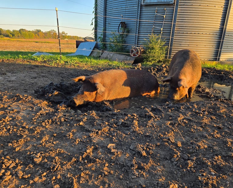 Our hogs live the high life here at Backroad Barnyard! They have free-choice, organic feed available at all times, space to roam and forage in our wooded pastures, a clean barn for shelter, fresh water and companionship. Reserve a hog for your family and know that you're providing the purist, healthiest, and best tasting pork to nourish the ones you love!